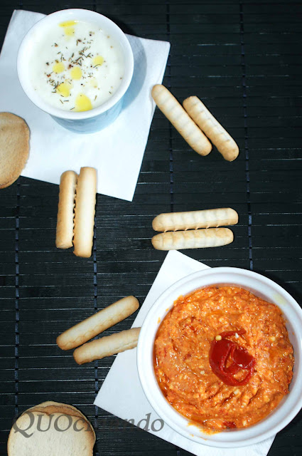 Me encanta la cocina griega la verdad, esa mezcla entre lo mediterráneo y lo oriental me gusta muchísimo, pero lo que son las cosas, siempre se enreda una y va dejando pasar recetas. Así que cuando Ly propuso como tema de este mes dips, mi mente hizo una relación directa con los tradicionales mezés griegos, una especie de salsas variadas que se comen con pan o que se incluyen como complemento a pescados, carnes y verduras y que suelen servirse como aperitivo. Al fin y al cabo, unos dips en toda regla. Así que entre la larga lista de mezés que tiene mi libro me he decantado por estos dos: el Tzatzíki o la crema de yogur con ajo y pepino y el Jtipití, que es la crema de feta y pimientos asados.